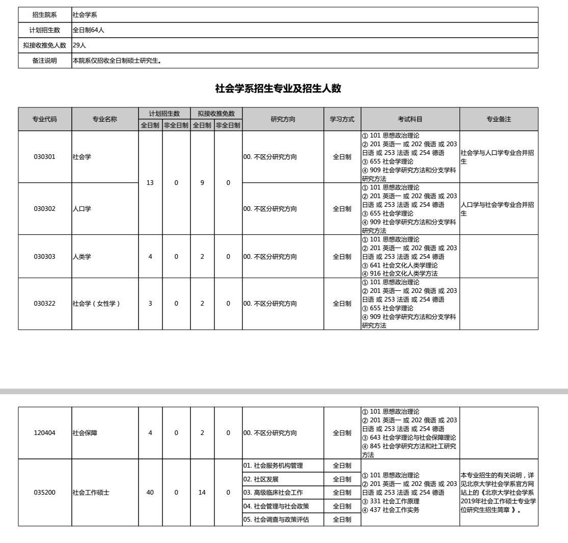 北京大学2019年社会学系研究生考研专业目录