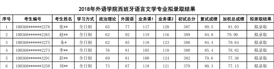 五、对外经济贸易大学西班牙语语言文学专业研究生拟录取情况(2018年名单):