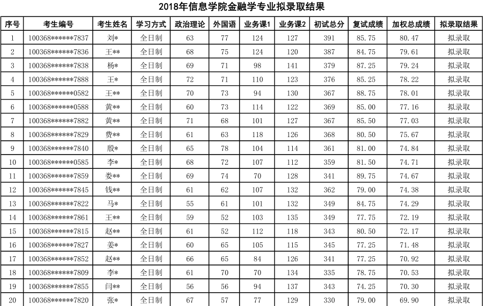 五、对外经济贸易大学信息学院金融学专业研究生拟录取情况(2018年名单):