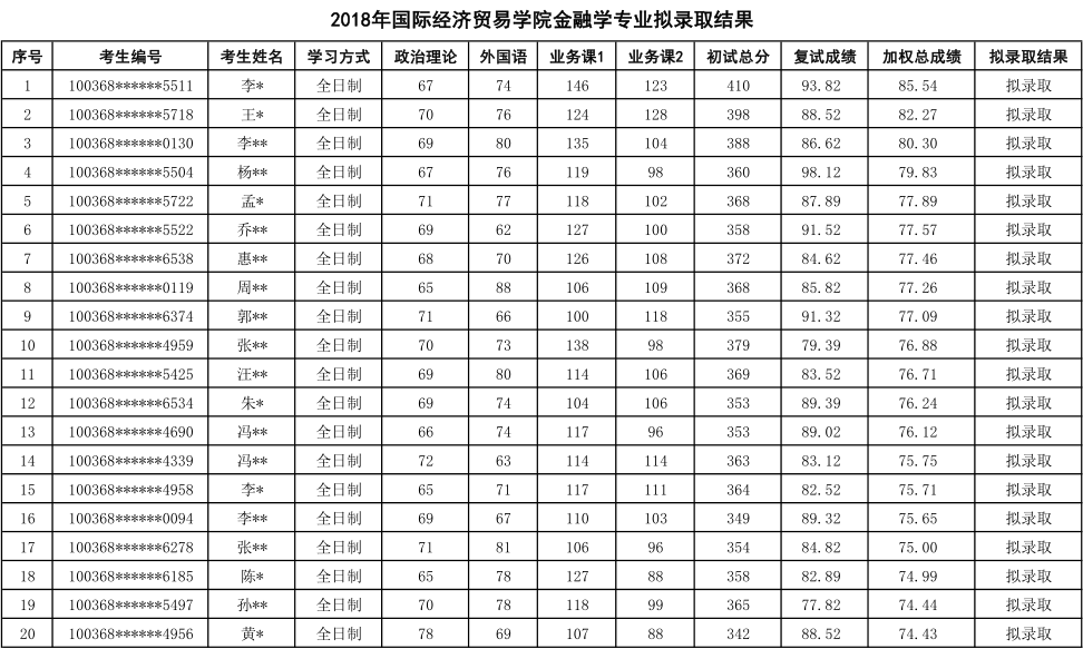 五、对外经济贸易大学国际经济贸易学院金融学专业研究生拟录取情况(2018年名单):