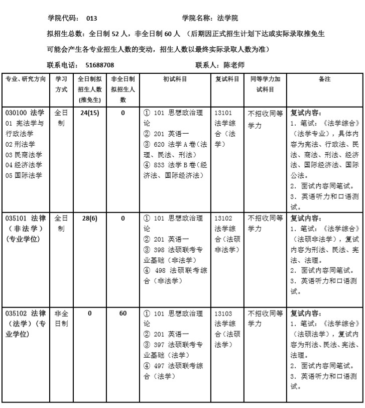 复试内容:1.笔试:《法学综合》(法学专业),具体内容为宪法、行政法、民法、商法、刑法、经济法、国际经济法、国际公法;《法学综合》(法硕专业),具体内容为刑法、民法、宪法、法理;2.面试内容同笔试;3.英语听力和口语测试。