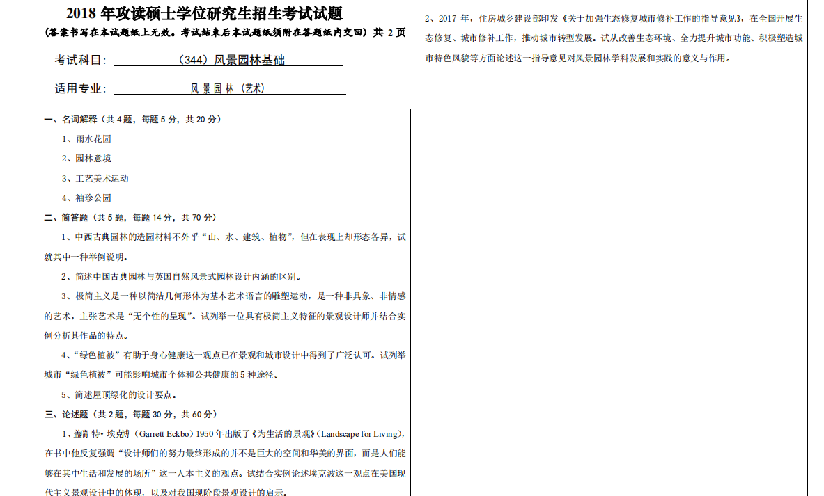 2018年西安建筑科技大学风景园林考研344风景园林基础(艺术)考试真题