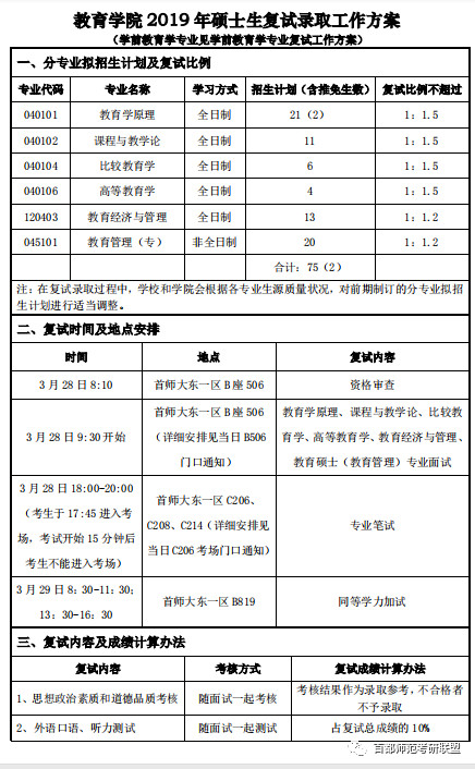2019年首师大教育学院硕士研究生复试录取方案