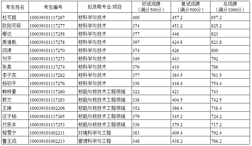 清华大学核能与新能源技术研究院2019年硕士研究生统考拟录取名单