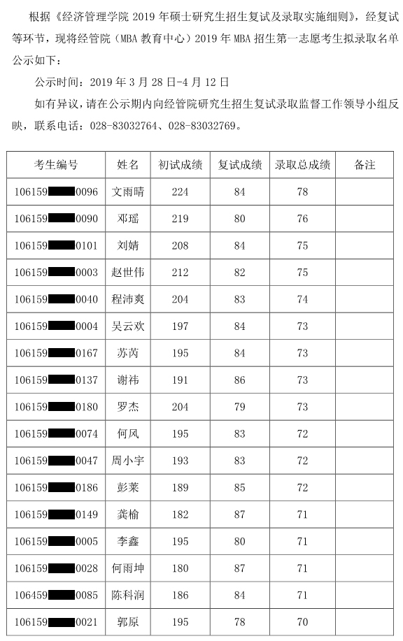 经管院(MBA教育中心)2019年MBA招生第一志愿考生拟录取名单公示