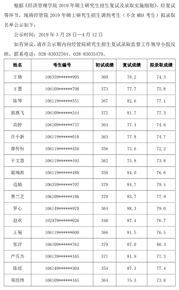 如有异议,请在公示期内向经管院研究生招生复试录取监督工作领导小组反映,联系电话:028-83032764、028-83035479。