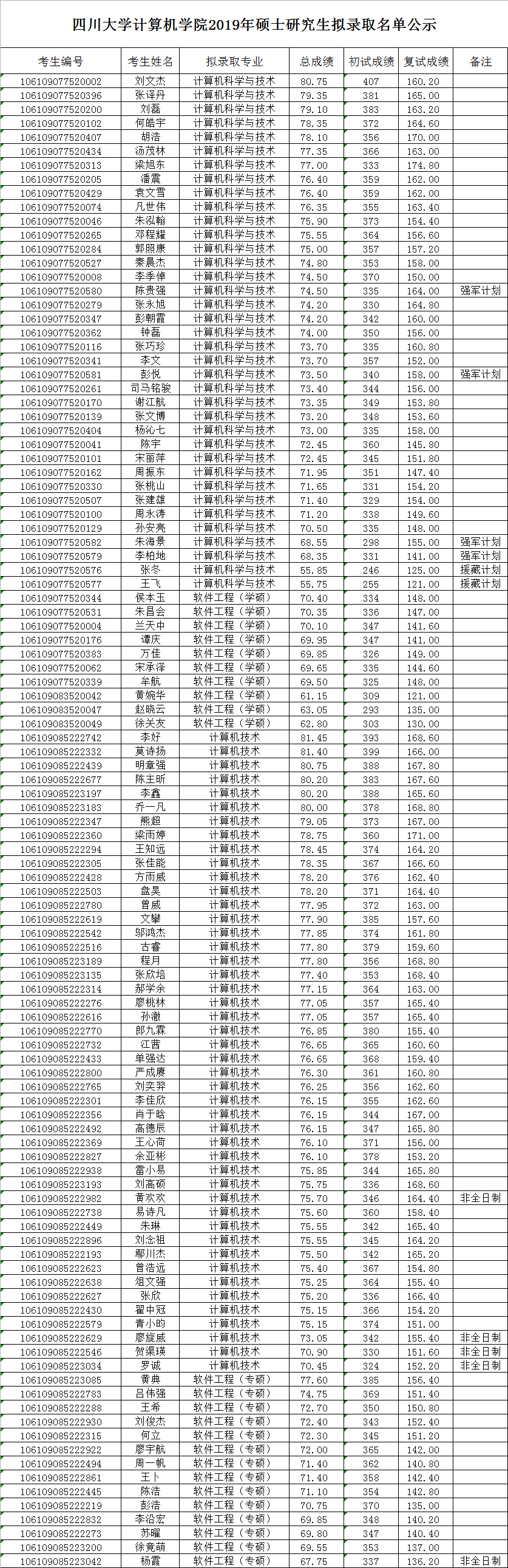 四川大学计算机学院2019年硕士研究生拟录取名单