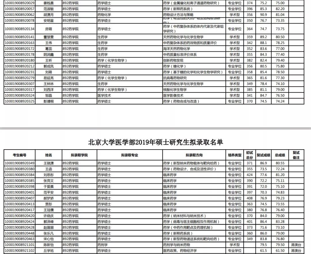 北京大学医学部2019年药学院硕士研究生拟录取名单