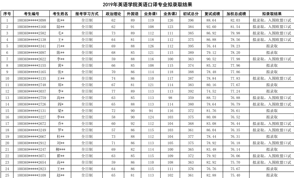 2019年对外经济贸易大学英语口译专业硕士研究生拟录取名单