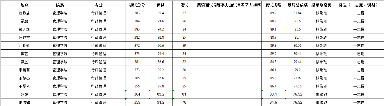 19行政管理专业报名313人,进入复试20人最低分355,最高分384;录取12人