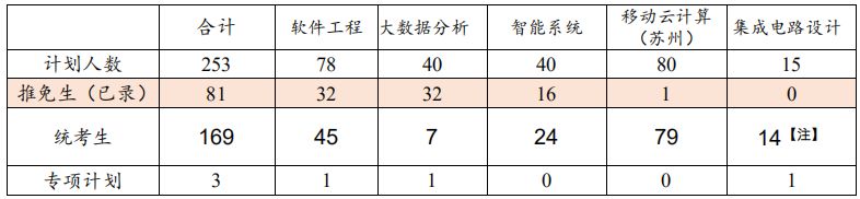 软件学院今年拟录取全日制软件工程专业学位研究生 169 名(不含应 届推荐免试研究生 81 名)、专项计划 3 名(其中四大奖励计划 1 名、强军计划 1 名、退役大学生士兵计划 1 名)。招收的专业方向(地点)包括:①软件工程、②大数据分析、③智能系统、④集成电路设计、⑤移动云计算(苏州)。各专业方向(地点)拟招生人数如下