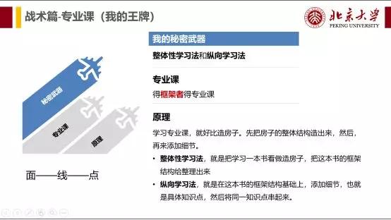 2. 整体性学习法(面): 就是把学习一本书看做造房子,先把这本书的框架结构给整理出来。让大家首先宏观上理解这门学科以及这门学科与其他学科之间的联系,首先看到整张知识地图,每当你学一个知识点,都可以清楚的看到这章的知识点在这门课的位置!