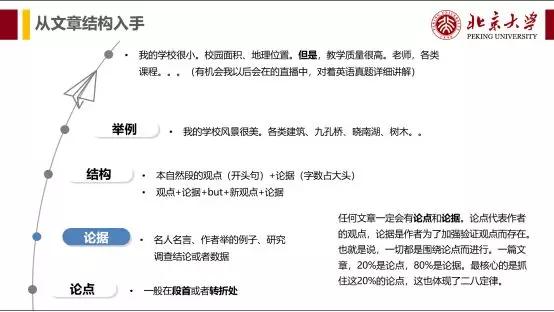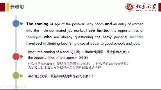 3. 关于长难句:考研的句子经常是,一个句子很长很复杂。可能学到最后,你发现单词背下来了,一个句子里面的每个单词都认识,但是这个句子还是读不懂,更别说整个文章和做题了。经过我多年对真题的摸索,句子是如何变难的,就是将主谓宾隐藏在长句中,看着很复杂而已。我自己摸索出来,一个方法,别管主谓宾定状补,看长难句,注意关键词。长难句的主要矛盾就是这些关键词。具体方法上述的PPT已经写得很清楚了,实在理解不了,到时我会在课程里面讲我的长难句技巧,可以报新祥旭的课程。