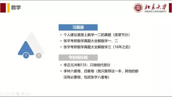 说明: 其他经验贴都会说,暑假之前把某某书看多少遍,复习多少轮。说实话,数学我感觉没必要规定什么时间看完什么书,多久看一遍,这样是不科学的。 我的建议:慢慢学,关键是把每一题搞懂。哪怕考试之前你只看了一遍,但是把我推荐的教材、习题册每一题都搞懂了,成绩也不会太差。
