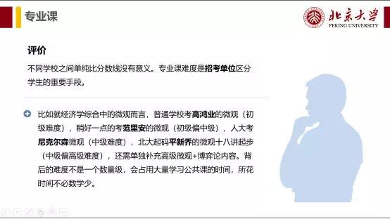 2.升级到整个考研高度:专业课的分值150,这意味着专业课的重要性不亚于数学!对于专业课,首先,要保证自己能够及格。你以为及格很容易? 18年北大专业课风格大变,及格率大概在25%-30%左右,四个人里面只有一个人能够及格。不及格意味着,即使你总分达到了复试线,单科线不过,依旧无缘你理想的学校。其次,达到90-110这样一个中等水平分数段,即使是中等分数,也意味这你的专业课要大量扩展其他书籍,主要包括流行的国外著名教材+国内饱受好评的教材。比如,投资学——博迪、公司理财——罗斯、国际金融——姜波克、金融市场学——张亦春、微观经济学——平新乔、博弈论——张维迎、宏观经济学——罗默。至于能否上110,甚至130,就要看你能够把你的专业课学到多么深的地步了。