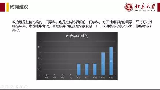 1. 升级到整个考研高度:政治在整个考研四门课中是次要矛盾。我对大家提出的 要求是——及格为王。政治拼了命提高五分花的时间,数学、专业课轻松提高15分。边际效用递减,还是那句话,考研时间就是生命,你既可以提高每天学习的时间,你也可以提高单位时间的性价比,花最少的时间,拿最高的分数才是王道。