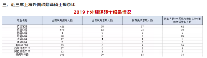 一、上海外国语翻译硕士考试科目 (含推免生,推免 录取一般不超过总 人数的 70%) 0551 翻译硕士 (全日制学习) 055101 英语笔译 1.公共服务笔译* 拟招 54 人 2.商务笔译* 3.技术笔译* 4.法律翻译* 5.本地化及项目管理* 6.人工智能辅助笔译* 055102 英语口译 1.会议口译* 拟招 35 人 2.公/商务口译* 3.会议管理* 4.人工智能辅助口译* 055104 俄语口译 俄汉英口译 拟招 5 人 055106 日语口译 1.日汉口译 拟招 7 人 2.日汉英口译 拟招 3 人 055108 法语口译 法汉口译 拟招 5 人 055110 德语口译 德汉英口译 拟招 5 人 055112 朝鲜语口译 朝汉英口译 拟招 5 人 055114 西班牙语口译 西汉英口译 拟招 5 人 055116 阿拉伯语口译 阿汉英口译 拟招 5 人 俄语口译、日语口译(仅日汉英口译方向)、德语口译、朝鲜语口译、西班牙语口译、阿拉伯语 口译专业,在复试时均会测试英语能力。 二、上海外国语翻译硕士复试分数线 上外初试成绩按技术分排名。技术分=专业一+专业二+总分*10%(满分450分)。换言之,政治英语过国家线即可,专业成绩排名基本就是你初试的排名。 四、上海外国语翻译硕士考研参考书(仅供参考) 翻译硕士英语: 推荐参考书: 《新编英语教程》 李观仪 上海外语教育出版社 《中式英语之鉴》 琼平卡姆 外语教学与研究出版社 《GRE阅读39+3全攻略》 魏宇燕 北京大学出版社 《英国散文名篇欣赏》 杨自伍 上海外语教育出版社 参考书解析 题型包含完型、阅读和写作三部分(2017年题型改革、仅剩阅读问答和写作两个部分),主要考察学生的英语能力。学生备考时要注重英语基础,着重提高阅读和写作能力。无选项完型应该是所有人的难点,大家平时一定要多做练习,多看一些FinancialTimes、Economist的文章,记住文章里面的一些固定搭配、连词、动词等;阅读理解一定不要有严重丢分,要重点复习,多做练习,提升速度和准确度;作文没有诀窍,需要平时的积累,建议每周3篇左右,多积累好的词组、模板等,尽量使用一些高级词汇来提升作文的规格。 英语翻译基础: 推荐参考书: 《高级英汉翻译理论与实践》 叶子南 北京大学出版社 《高级口译教程》 梅德明 上海外语教育出版社 《口译:技巧与操练》诺兰杰姆斯 上海外语教育出版 参考书解析 题型包括英汉短语翻译及解释,中英文章节选翻译,主要考查学生的语言运用能力及整体知识结构。备考时,既要顾及翻译理论技巧的学习,又要勤加练习,广泛涉猎。 做好翻译的基本条件就是积累大量的单词,这个是确定考研一开始就要做的事情,基础打好了,才能往更高的层次延伸,翻译不是一两天就可以练好的,需要长时间的积累、练习,英语翻译基础总分150分,属于重点复习的科目,在做题的过程中,可以参考二笔的文章,大家在练习时,要能够在一次次的练习中找到自己的短处,例如句子结构、语法、词汇的使用等等,都是需要注意的,翻译后对照给出的译文来进行比较,争取每一次都能够有所进步。 汉语百科: 推荐参考书: 《中国文化要略》 程裕祯 2013-06-01 外语教学与研究出版社 《中国文学与中国文化知识应试指南》林青松2005-08-01东南大学出版社 《中国文化读本》(中文本)叶朗 朱良志2008-04-01 外语教学与研究出版社 参考书解析 上外百科着重在中国文学历史上,题型包括选择、成语解释、应用文写作、命题作文写作(2017年题型变化为问答和写作)。百科主要考中国古代文化、文学知识、近现代文化文学知识。应用文主要考查表述格式。命题作文以议论文为主,平时应注意积累观点和素材。 议论文在联系起来可能部分同学找不到复习的方向,大家平时可以多了解一些社会时事,多思考,从不同角度来看问题,找到问题分析的角度,在写文章的时候就会很快找到思路。关于成语解释,就需要大家背诵大量的成语知识了,可以参考一些成语故事类的书籍,这样便于大家理解记忆。 五、初复试题型 初试题型: 翻译硕士英语(100分) 一篇阅读回答问题 60分 一篇作文 40分 英语翻译基础(150分) 一篇英译汉 70分 一篇汉译英 80分 复试: 英语翻译综合-双向笔译与百科知识 (专业笔试+专业面试) 复试题型: 专业笔试——翻译综合-双向笔译与百科知识。题目和初试考题有所重复,考试题型有:名词解释、阅读新闻理解、文章翻译(汉译外,外译汉各一篇)等,难度适中但是题量很大,答题时应注意时间安排,题量很大一定要快写。 专业面试——分组分批进行,差不多每人十几分钟,问题类型有视译、翻译理论、翻译诗歌等。面试基本上都是简短交流(你为什么选上外、高翻)或者视译(给一段外文文章,看1分20秒左右,然给1分20秒口译出来)。 复试形式——差额复试,比例一般1:1.2-1.5 六、新祥旭考研辅导 考研辅导提供的拓展资料如下: 历年真题:专业课历年考试真题及答案解析; 内部资料:专业课内部重难点讲义和常考知识点笔记梳理; 其他资料:相关出题导师的期刊文章及论文集、案例分析补充材料等等; 考研辅导免费提供的附加服务如下: [1]免费提供考前应试指导; [2]免费提供复试咨询; [3]协助联系导师或者提供导师联系方式; [4]免费提供考研公共课复习指导或资料。