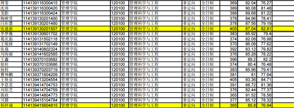 管理科学与工程录取21人,初试最低分365,最高分405