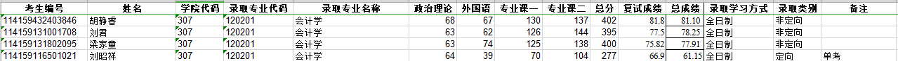 会计学录取4人,含单考1人;初试最低分395,最高分402