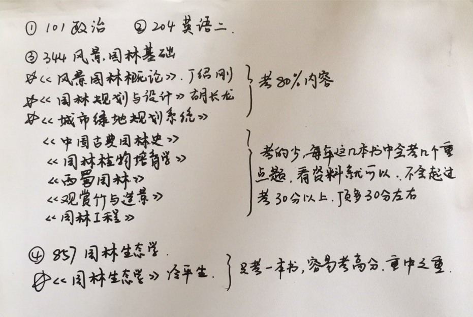 所幸,2018年最终考研成绩377分,政治57(不想提了,对于这个成绩很伤心,下面具体再说),英语69,344风景园林基础112,857园林生态学138,最终复试如愿,成功上岸。当时知道录取结果之后第一件事就是给我妈打了一个电话,告诉她我考上了,我妈也很高兴,对我说的第一句话就是:“祝贺你啊,功夫不负有心人啊。”其实听到这个,当时的成就感真的很大,那一刻就觉得付出的所有的努力都是值得的。下面就和大家具体的分享一下我考研过程的一些复习经验和经历(专业课主要针对我所报考的院校)。