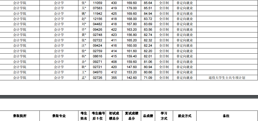 会计学统考录取15人,初试最低分408,最高分430
