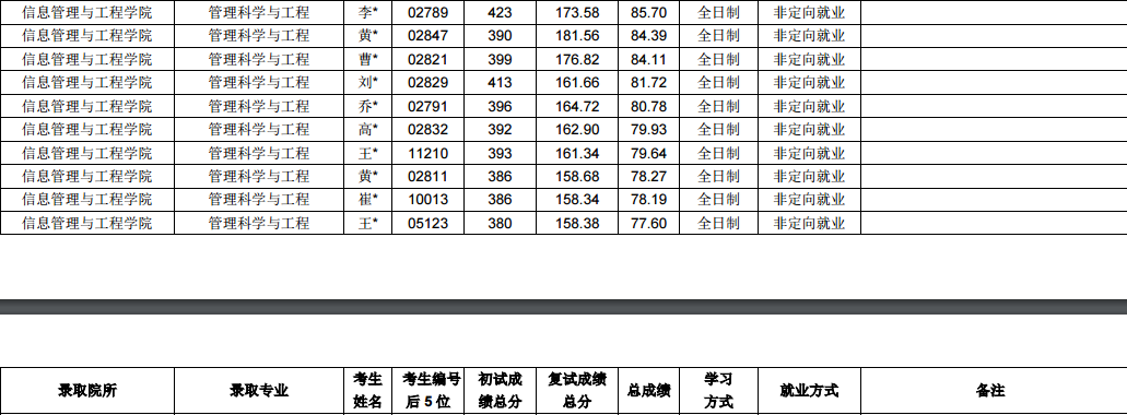 管理科学与工程统考录取10人,初试最低分380,最高分423