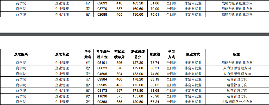 企业管理录取11人,A组战略与创新创业方向4人,B组人力资源管理方向2人,C组运营管理方向4人,D组大数据商务分析方向1人