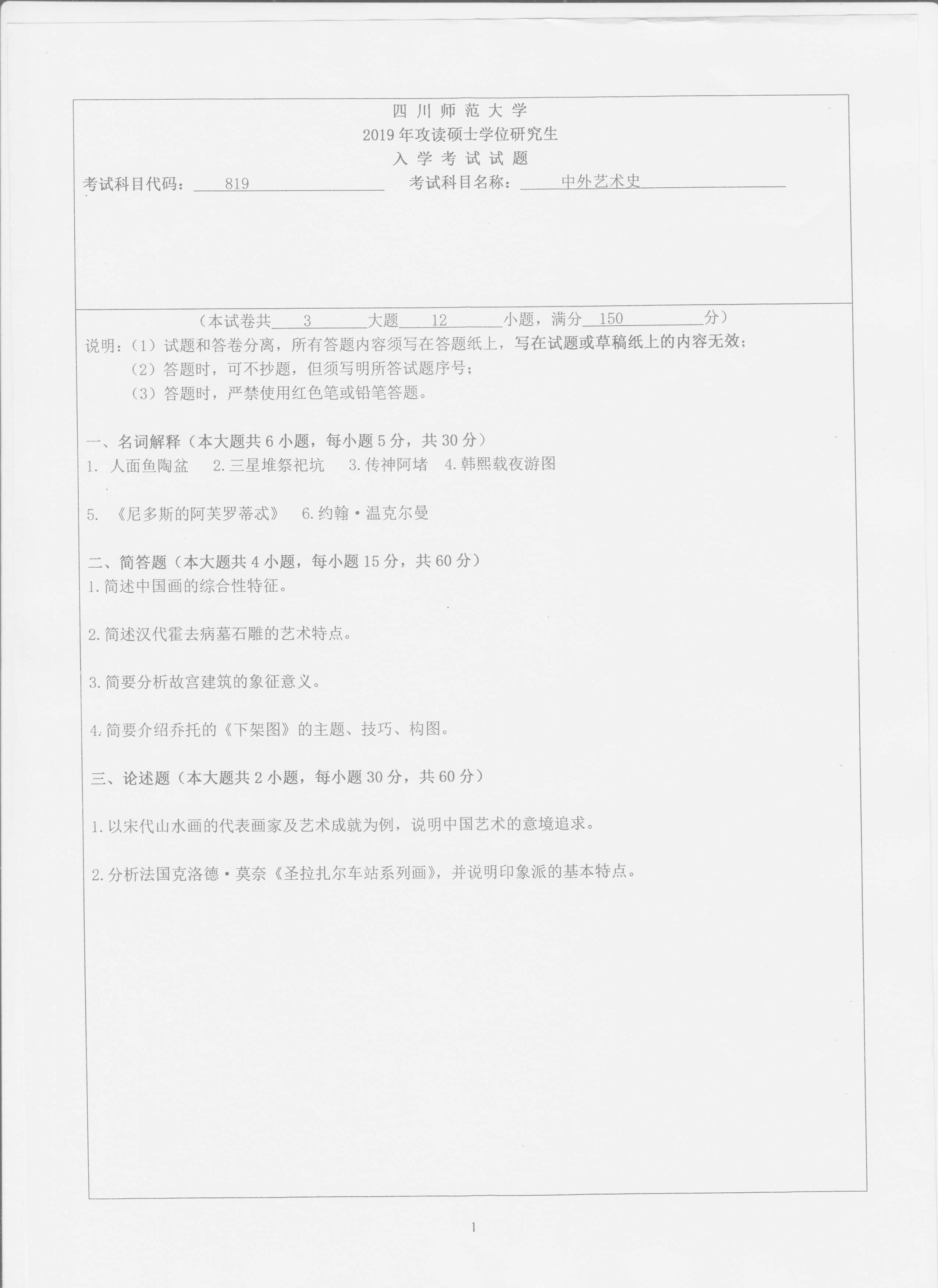 2019年四川师范大学艺术学原理819中外艺术史考研真题完整版--新祥旭