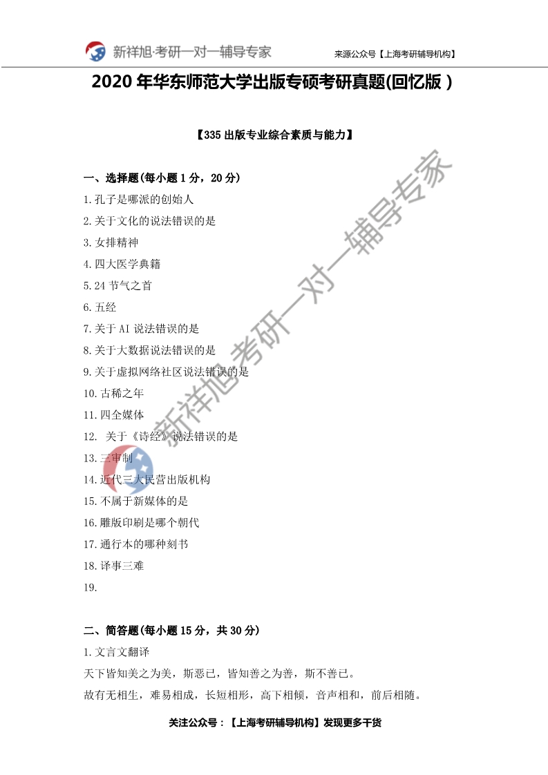 2020年华东师范大学335出版专硕考研真题(回忆版)