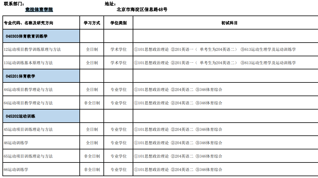 北京体育大学考研辅导班:北体竞技体育学院2020年考研招生目录
