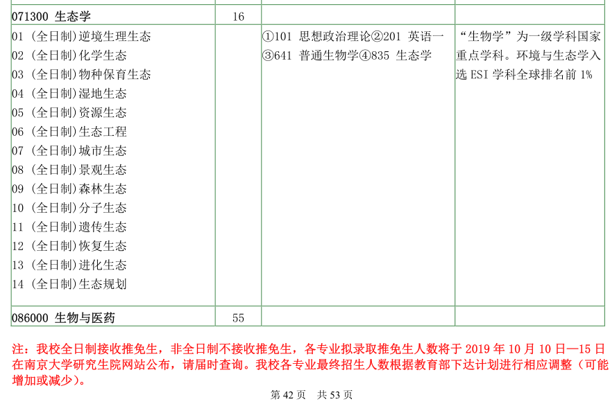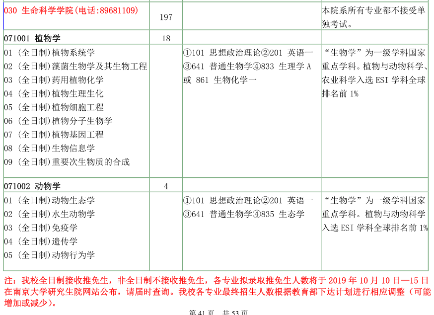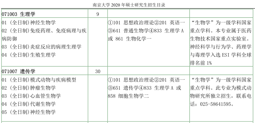 南京大学考研辅导班:南京大学生命科学学院2020年硕士研究生招生目录