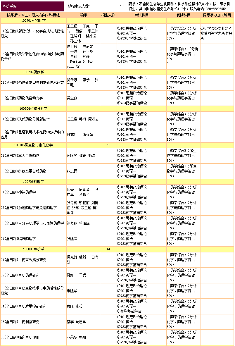 暨南大学考研辅导班:暨南大学2020年药学院硕士研究生招生目录
