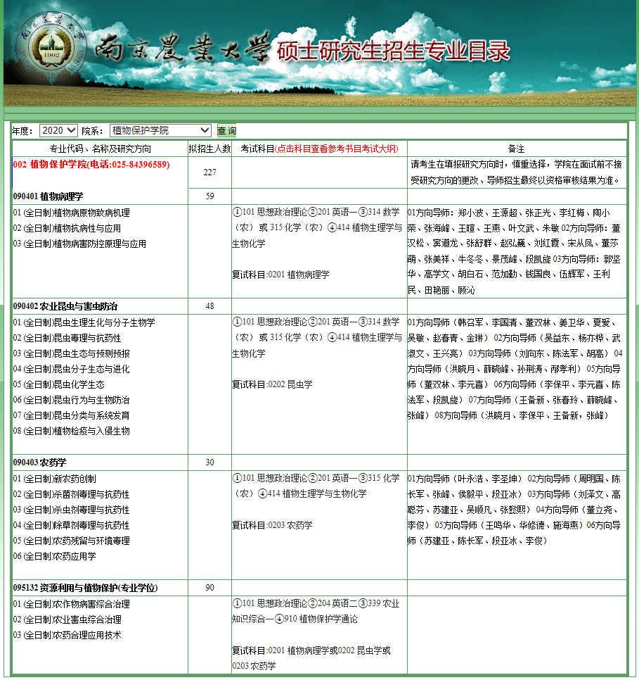 南农考研辅导班:2020年南京农业大学植物保护学院考研专业目录