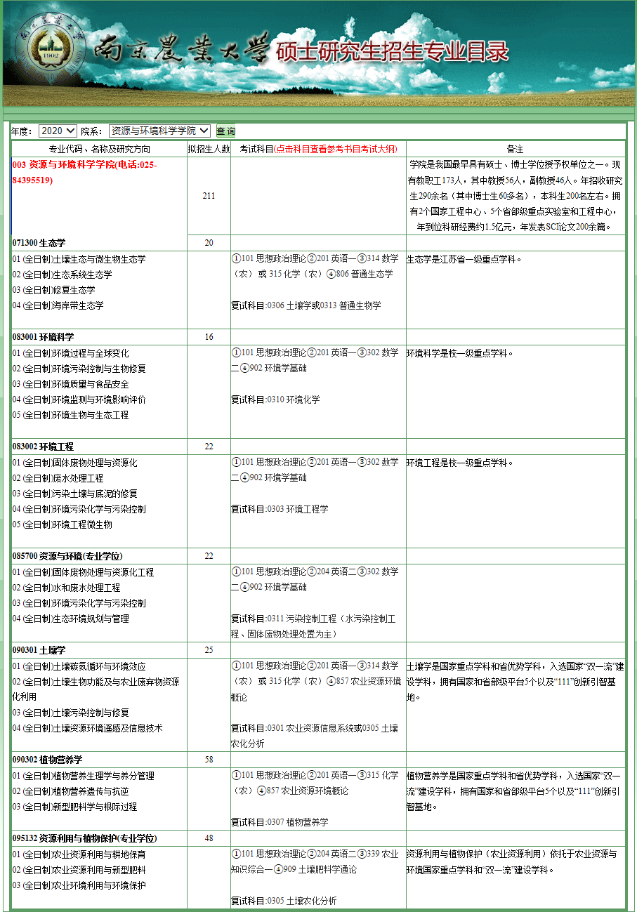 南农考研辅导班:2020年南京农业大学资源与环境科学学院考研专业目录