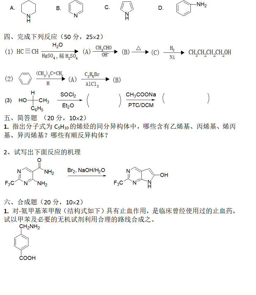 三、重点掌握:呋喃、噻吩、吡咯的结构;芳香性、酸碱性、亲电取代反应;呋喃甲醛的反应;咪唑、吡唑、噻唑的命名,互变异构及化学反应;吲哚的亲电取代反应;吡啶的结构、命名及化学性质;喹啉及异喹啉的命名及化学性质;喹啉的Skraup合成法;嘧啶的结构、命名及水溶性、碱性。