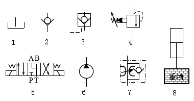 图4中给出了一组液压元件简化符号,请利用这些元件设计一个液压系统,用于将如图所示重物吊起或放下,且要求重物可在任意位置停住。试回答以下问题: