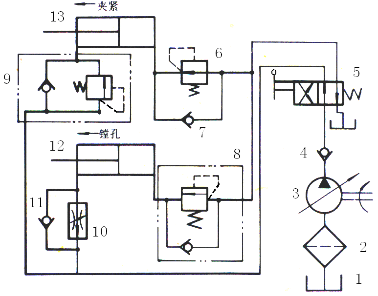 图5为镗床液压系统原理图,其工况为:夹紧—工进—加工—退刀—松开—停止。试回答以下问题: