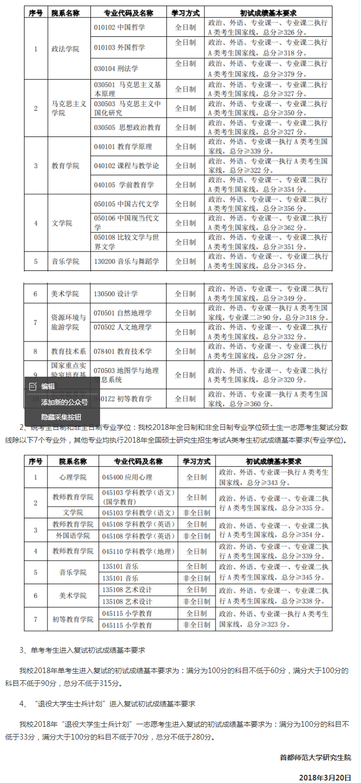 首都师范大学2018年硕士研究生一志愿考生进入复试的初试成绩基本要求