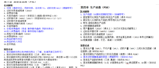 刚开始,就把所有的知识点都记一遍,要保证在大纲范围内的必须掌握。每开始背新的一章节时,首先再过一遍课本,然后开始背,背完把课后题做了。这个时候就已经过两遍课本了,该知道重点了,所以该总结了。那么怎么总结呢。下面放两张图片,大家可以按照这样的方式写在笔记本上,只写题目即可,不过目前你可能不知道哪个在真题中考过,所以要不断的补充。我这个是最终版本,刚开始总结,我也是在笔记本上不断地添加,这是微观第三章 第四章的总结。大家可以简单看下。按照这种格式整理。这样的话,在背诵时,你就知道哪道题掌握的不好,便于后期复习。