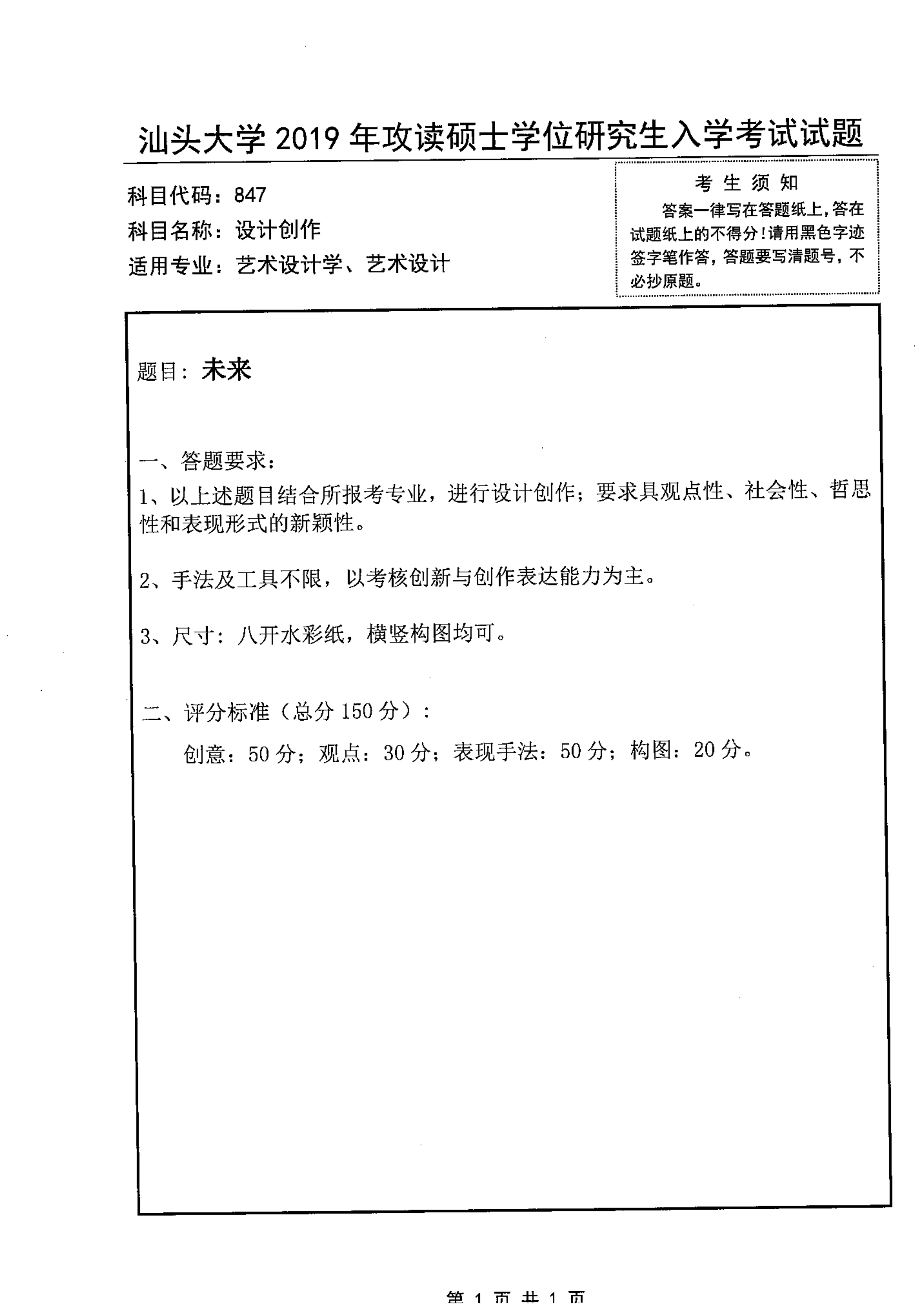汕头大学考研辅导班:2019年汕头大学考研847设计创作真题