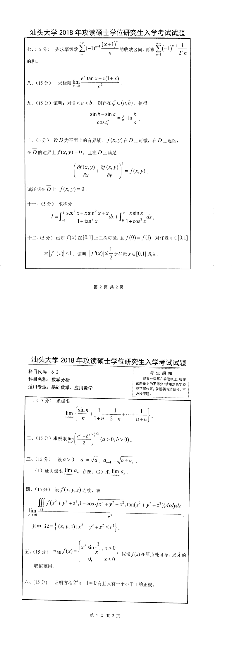 汕头大学考研辅导班:2018年汕头大学考研612数学分析真题