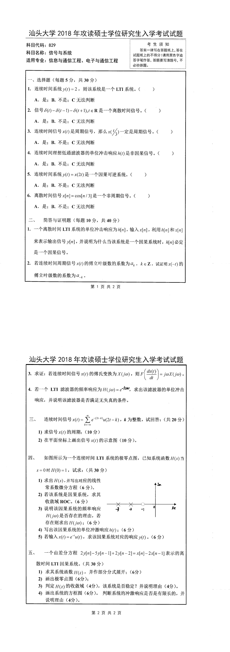 汕头大学考研辅导班:2018年汕头大学考研829信号与系统真题