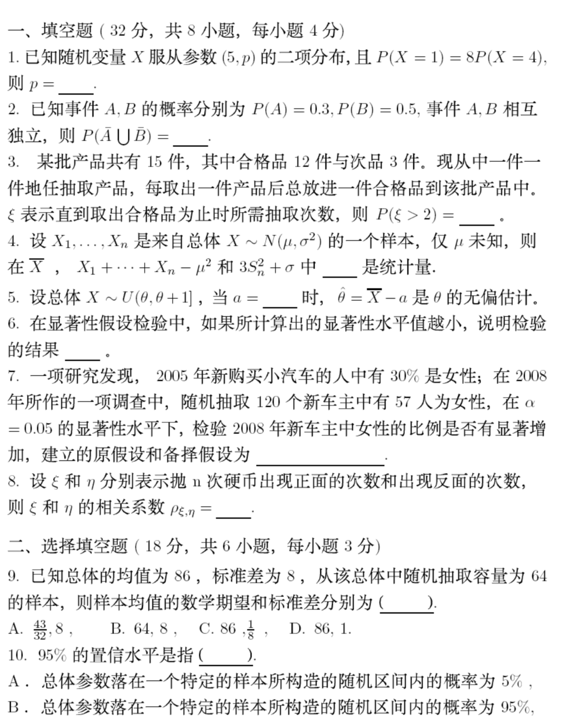 1. 填空题8题,每小题4分,共32分;