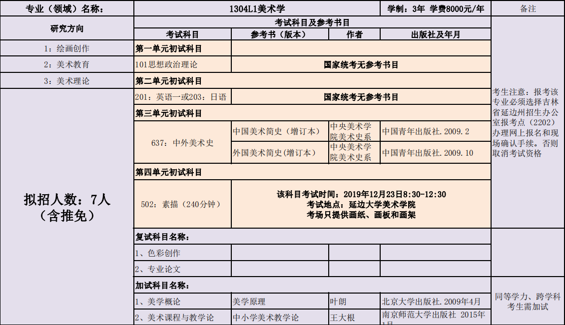 延边大学美术学院2020年度招收攻读硕士学位研究生专业目录表(学术型)