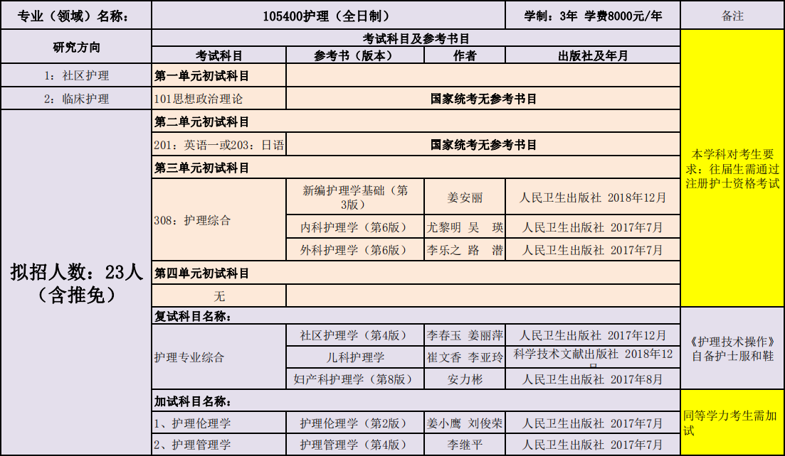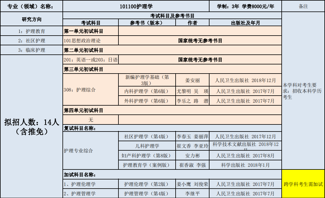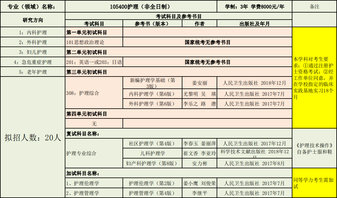 延边大学护理学院2020年度招收攻读硕士学位研究生专业目录表(学术型)