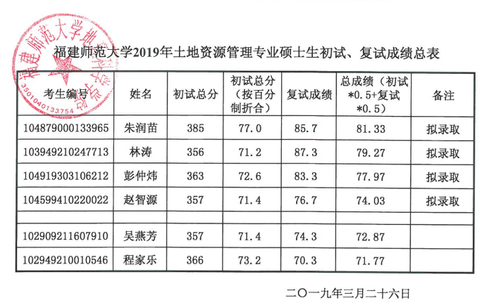 福建师范大学考研辅导班:福建师范大学2019年土地资源管理专业硕士生初试、复试成绩汇总表