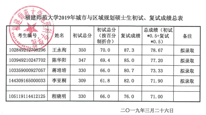 福建师范大学考研班:福建师范大学2019年城市与区域规划硕士生初试、复试成绩汇总表