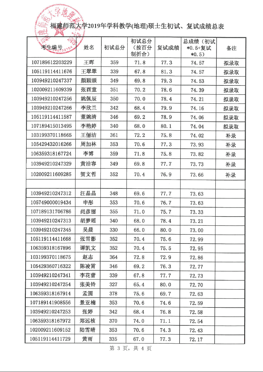 福建师范大学考研辅导班:福建师范大学2019年学科教学(地理)硕士生初试、复试成绩汇总表