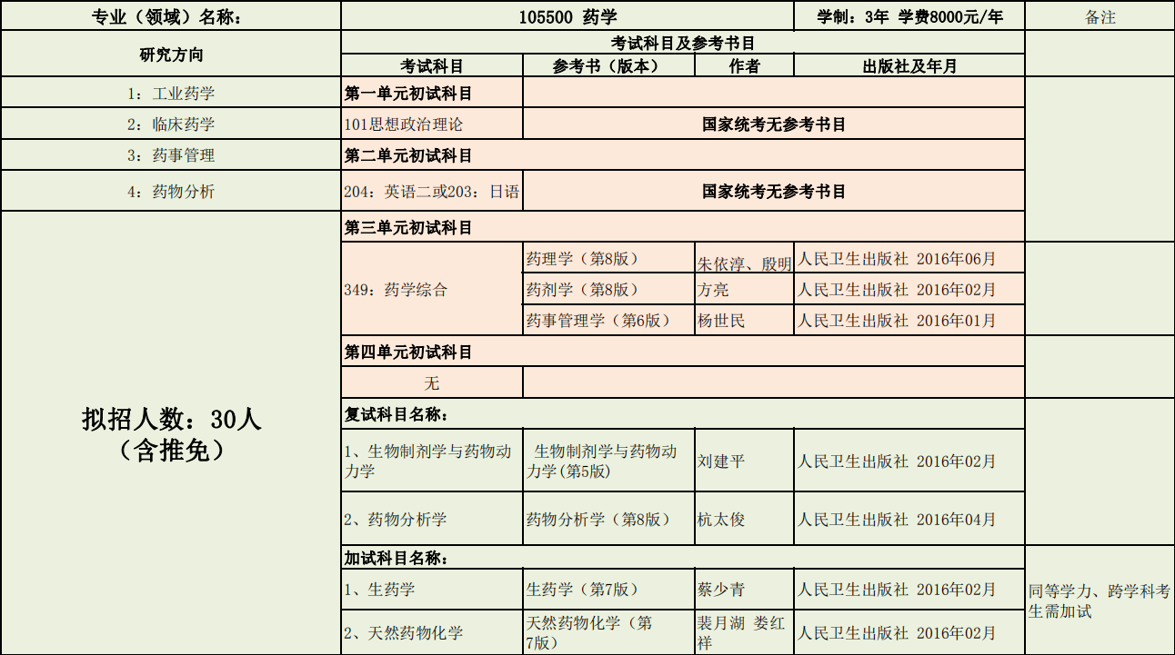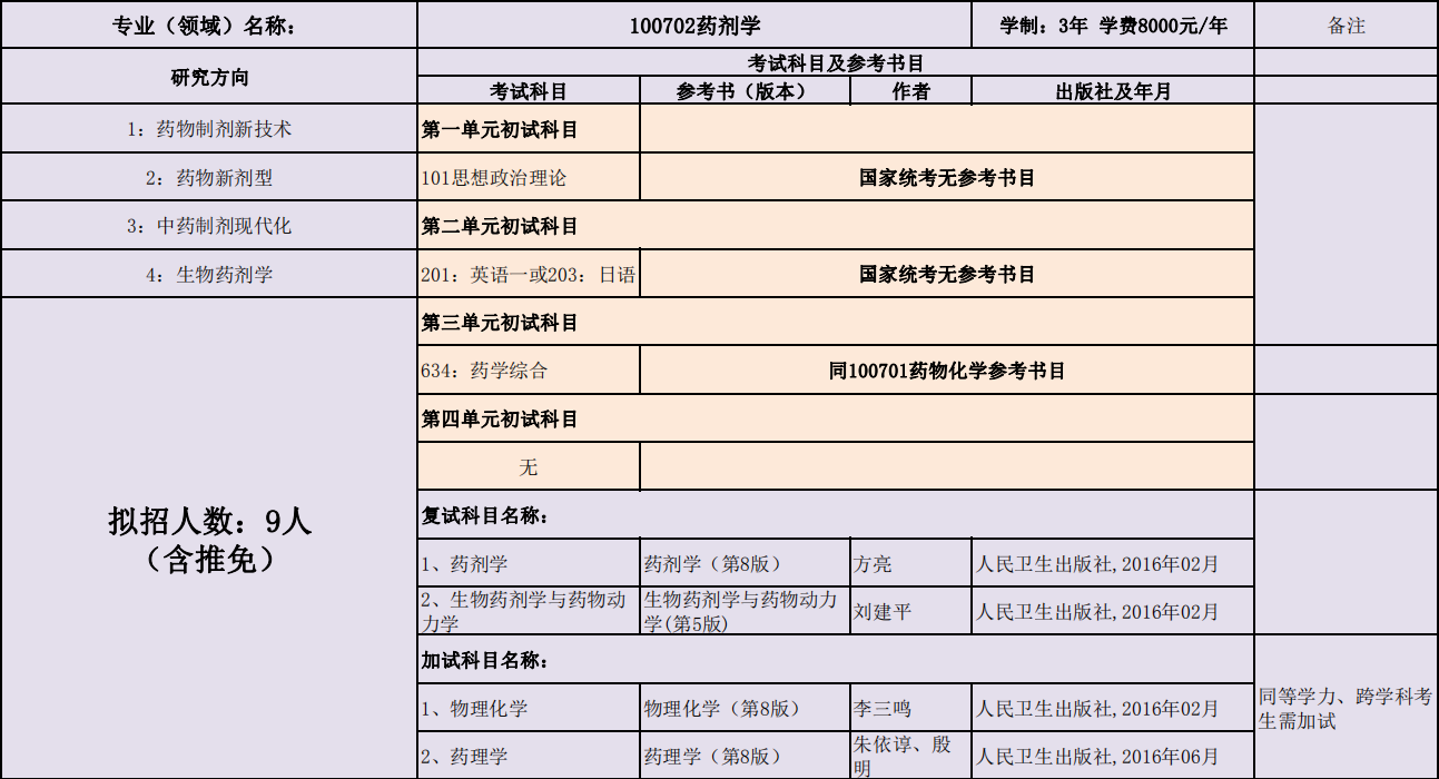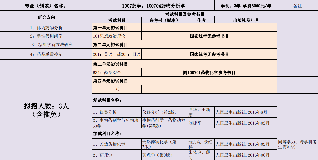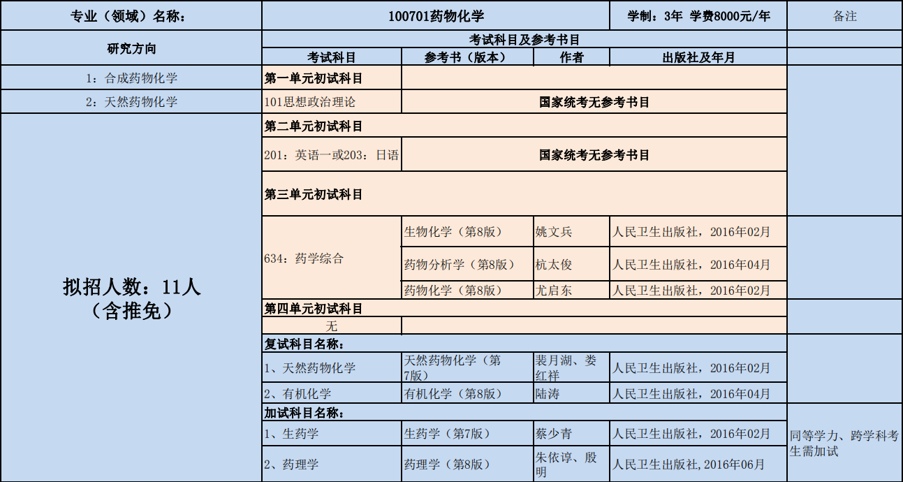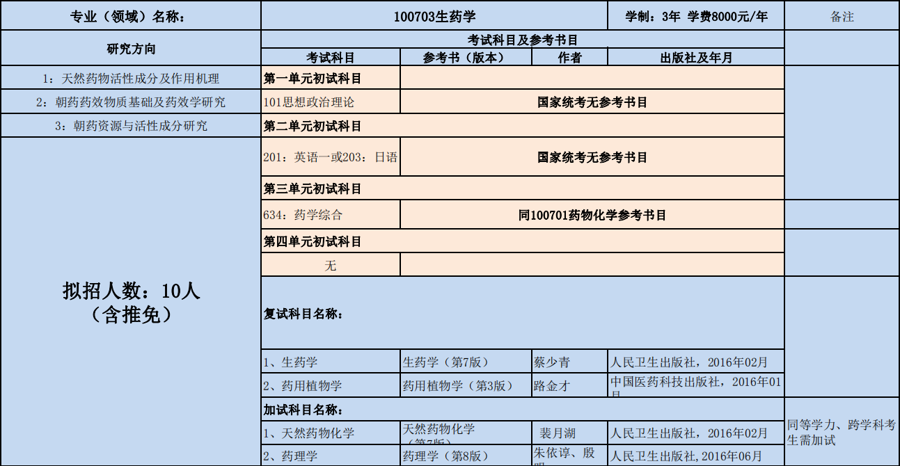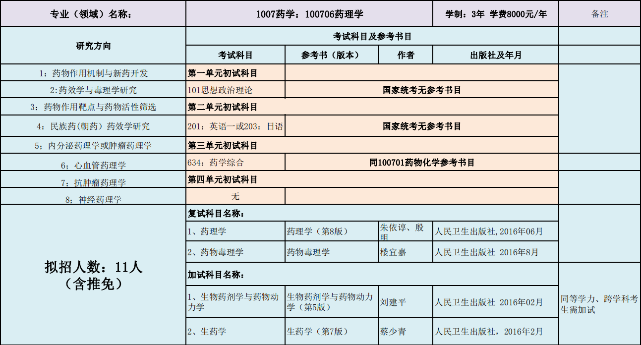 延边大学药学院2020年度招收攻读硕士学位研究生专业目录表(学术型)