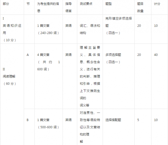 试题分四部分,共 48 题,包括英语知识运用、阅读理解、英译汉和写作。